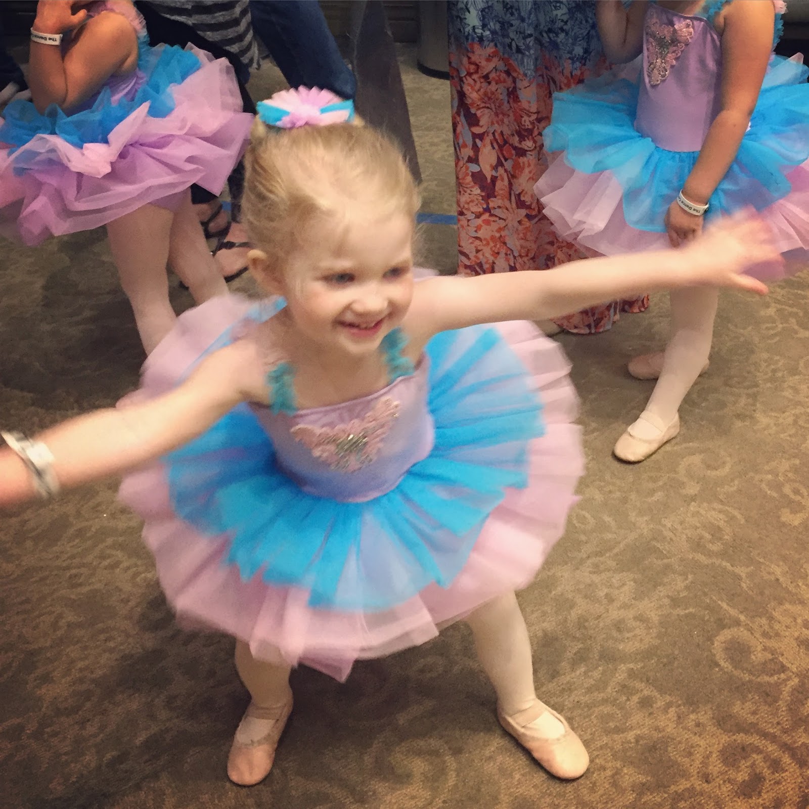 Raley had her very first dance recital a couple weeks ago. We were very unsure about whether or not she would actually dance once she got on stage. She was so excited about wearing her costume. After I got her dressed she kept saying “I wanna show Daddy!” and “Look at my beautiful costume!” She danced really well during dress rehearsal but she didn’t dance during the recital. I was just proud that she got on stage and didn’t run off or cry! She looked so beautiful!