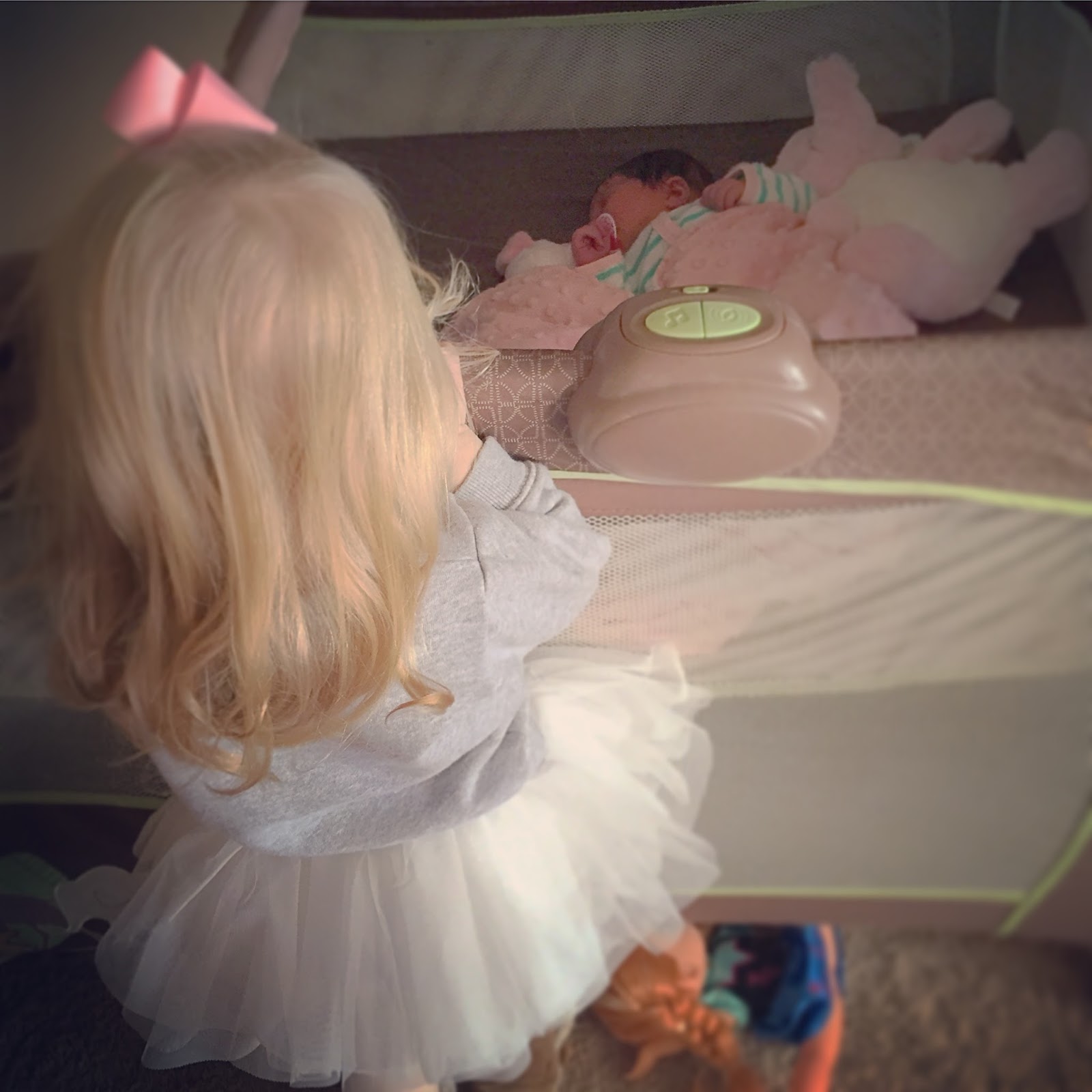 | Audrey spent a lot of time sleeping in the pack n play. Raley is admiring her before heading to dance class. |