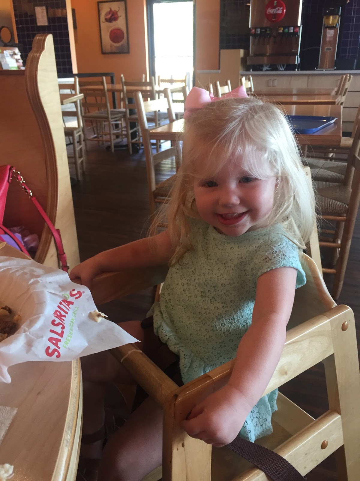 This little one thinks she’s a big girl. She was climbing all over the place and scaring me to death! She climbed up a super tall slide and all the way up to the top of the big kid play area and then back down. I thought for sure I’d see her tumbling down, but she handled it like a pro. This girl has no fear!
