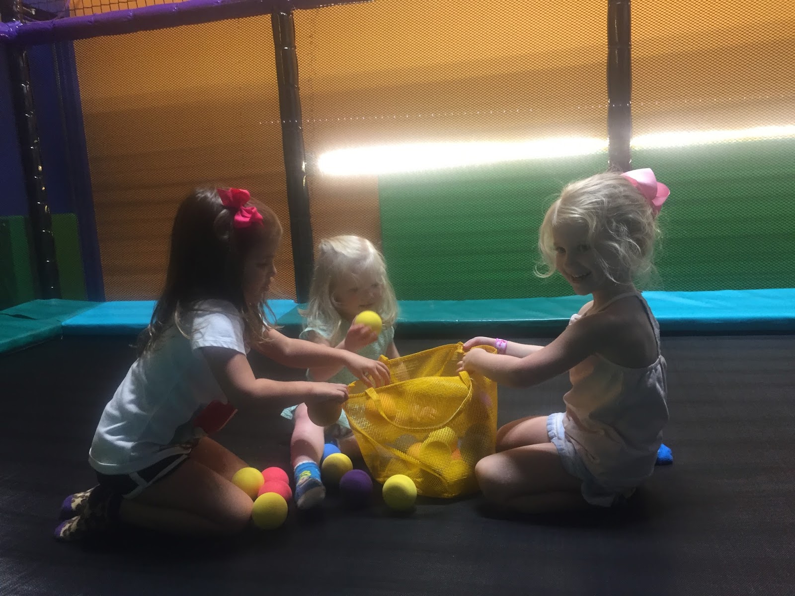 | They took some balls from another area onto the trampoline and in this picture they’re singing “clean up, clean up” and picking them up. |