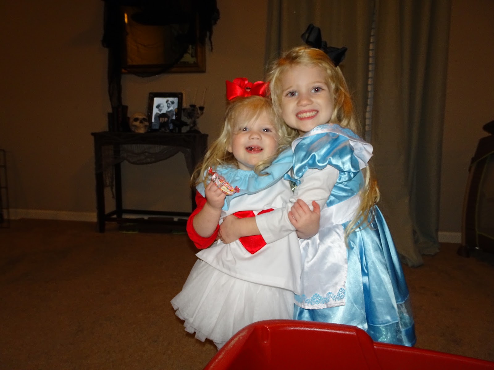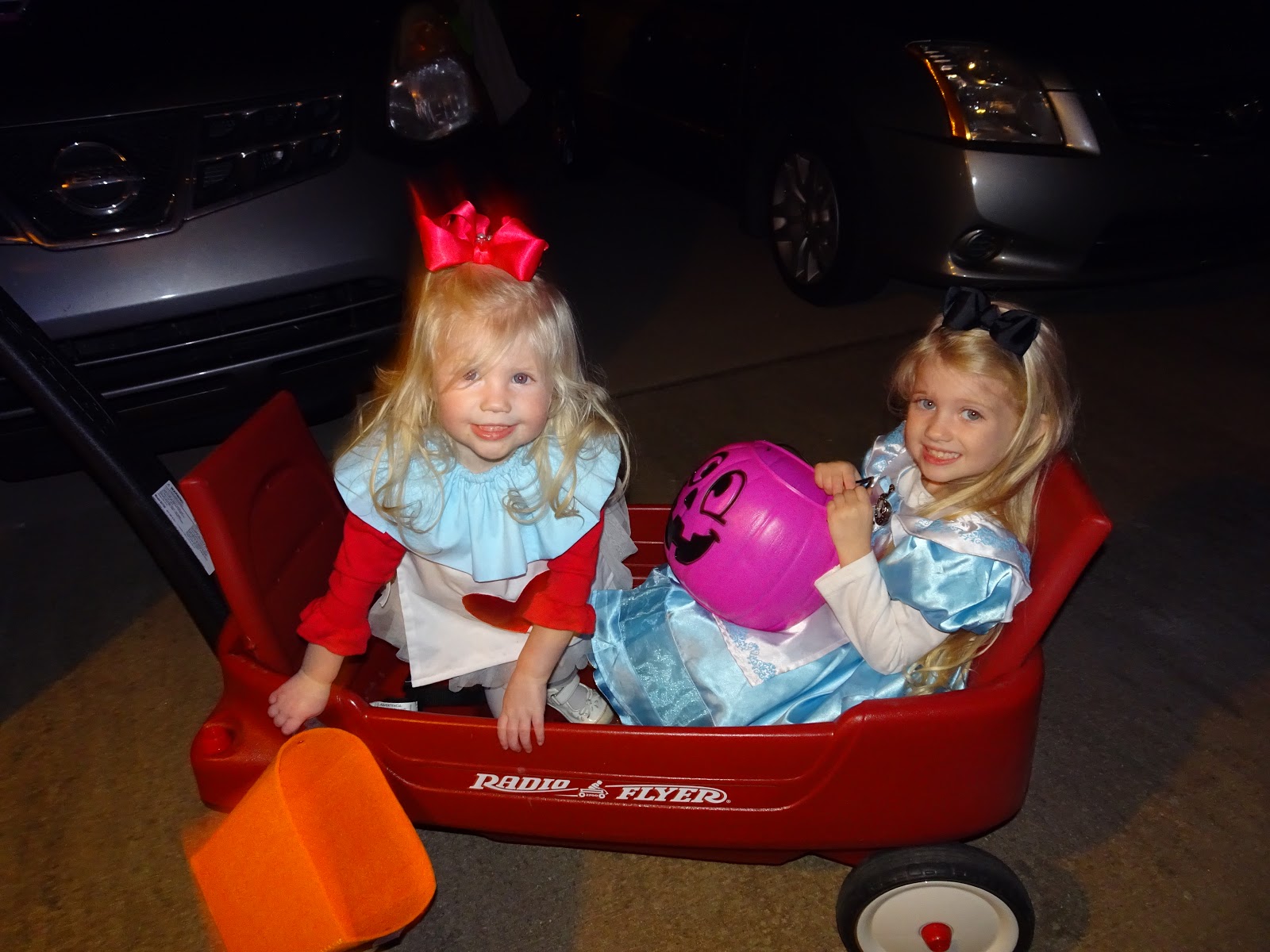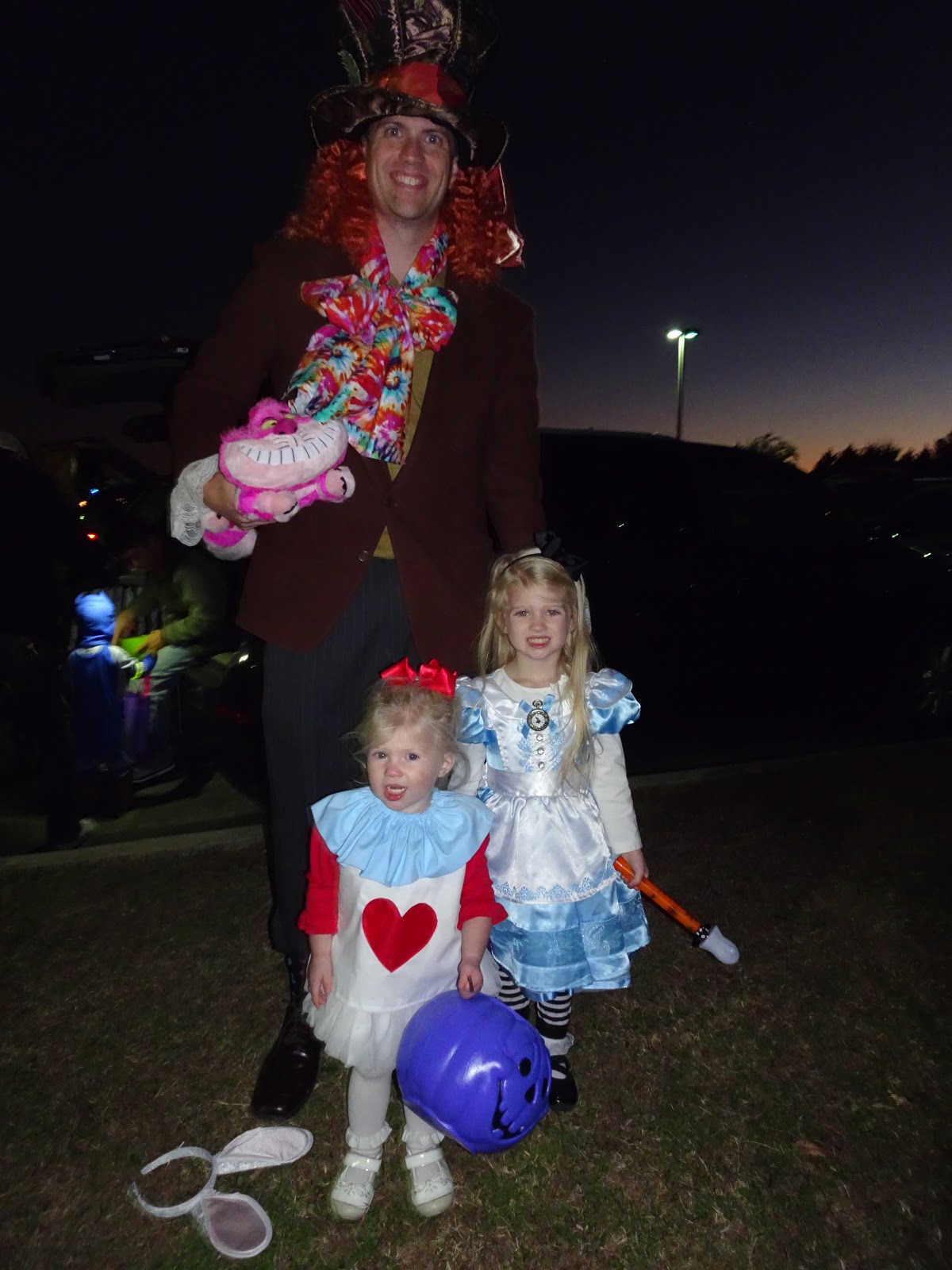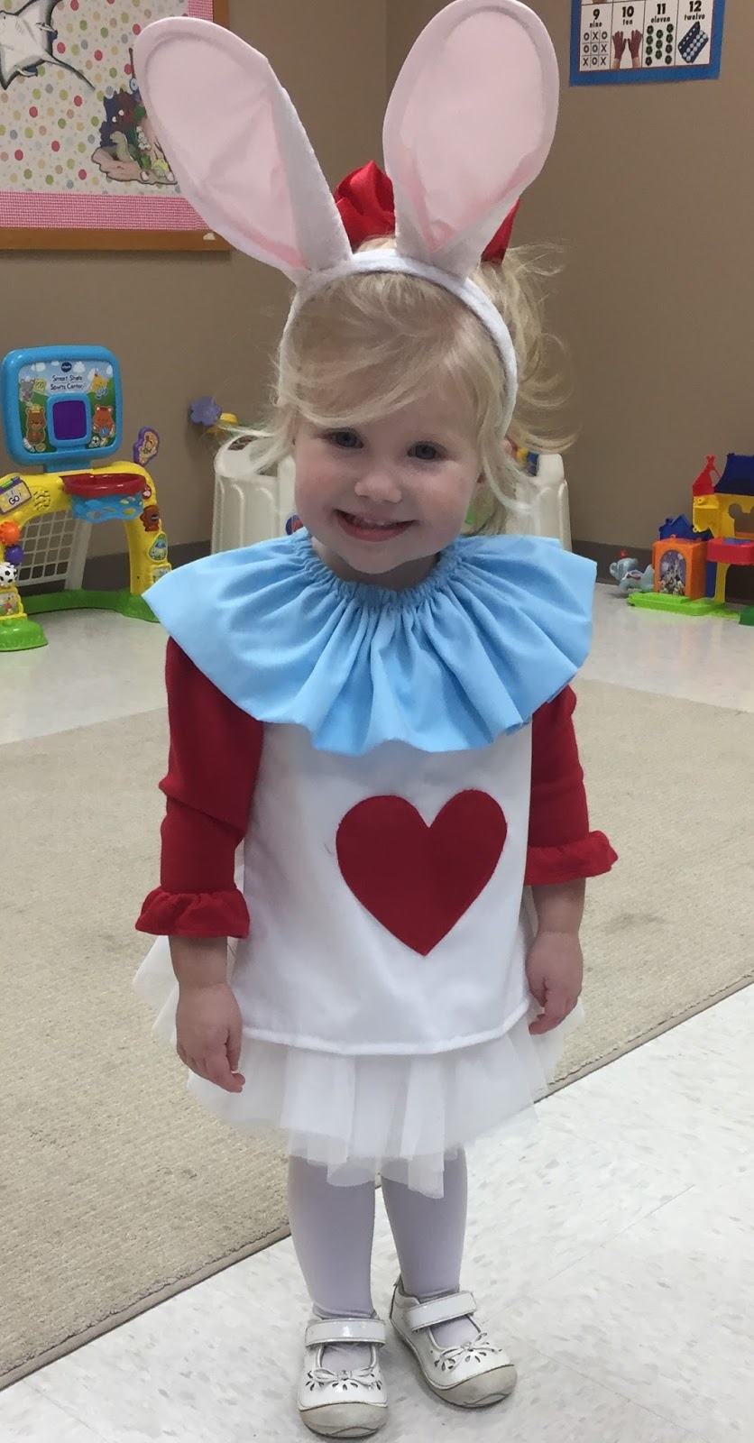 I LOVE family costumes so Audrey had to be the white rabbit. I wanted her to look cute and girly so I put together this idea. She’s wearing a red shirt under one of Raley’s dance leotards with a tutu. My Granny made the white piece with the heart and the blue collar. I think she looks perfect. Although those ears came off quickly.