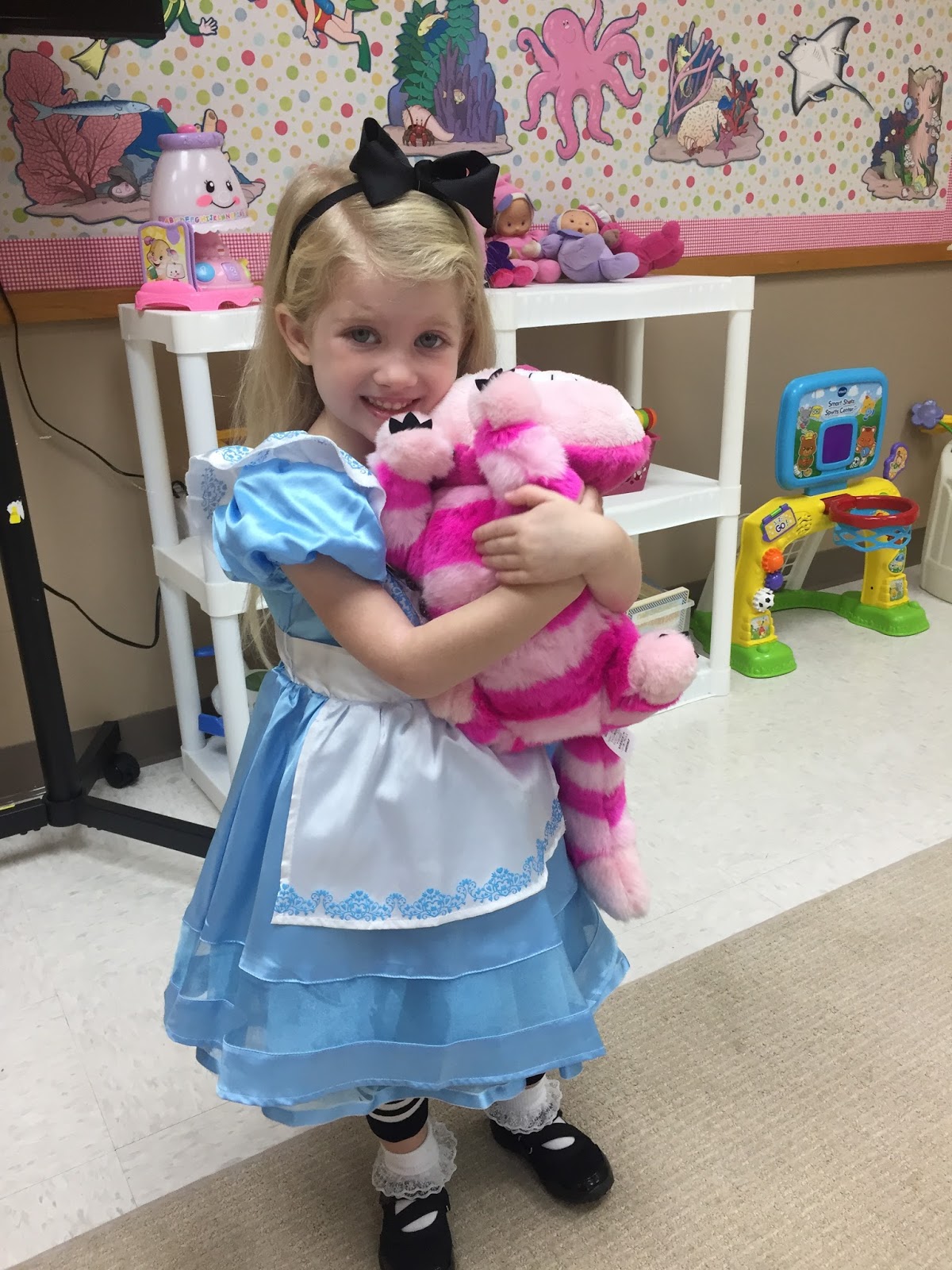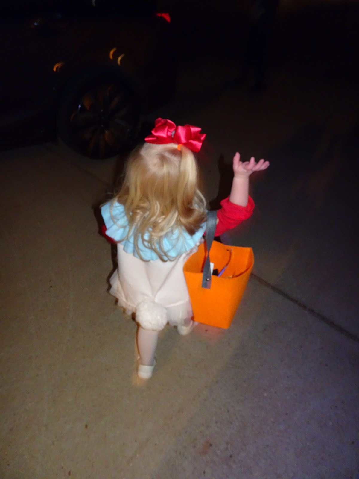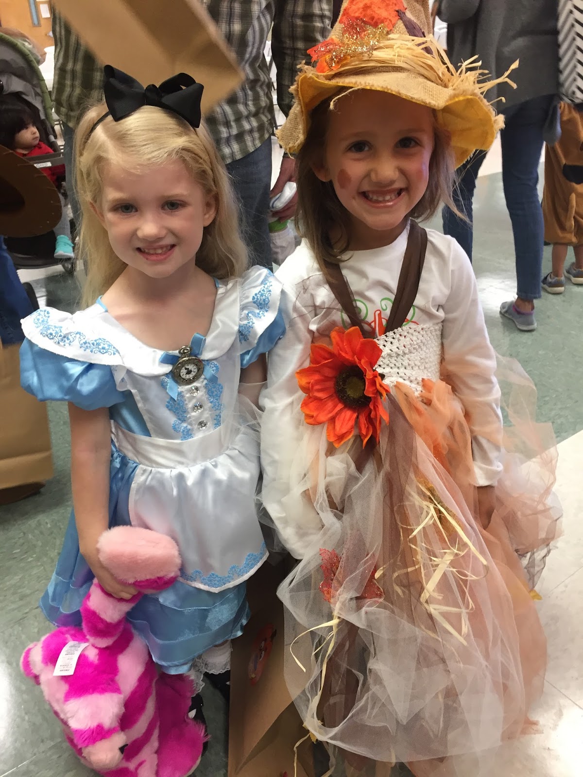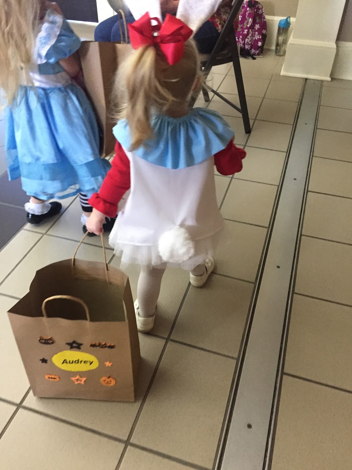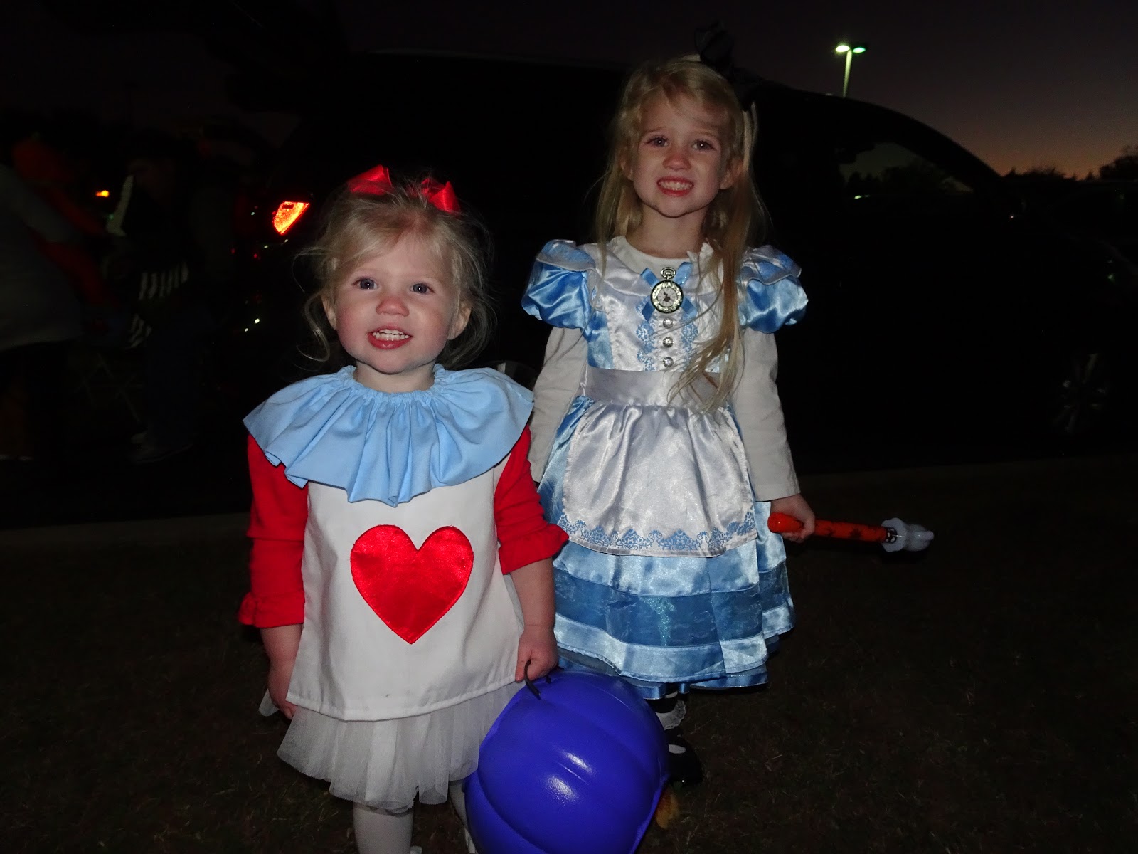 I LOVE family costumes so Audrey had to be the white rabbit. I wanted her to look cute and girly so I put together this idea. She’s wearing a red shirt under one of Raley’s dance leotards with a tutu. My Granny made the white piece with the heart and the blue collar. I think she looks perfect. Although those ears came off quickly.