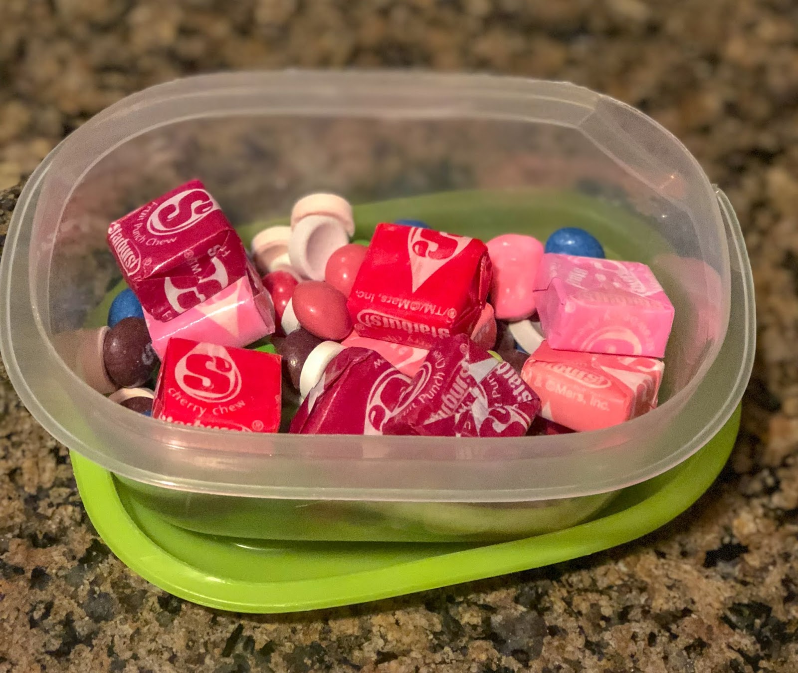 – We used stickers and candy as rewards. We had several packs of Skittles, Smarties, Starburst and Pez left in our candy basket from various holidays and events at school, so we opened them all up and poured them into a Tupperware container, which she knew was her potty treats.