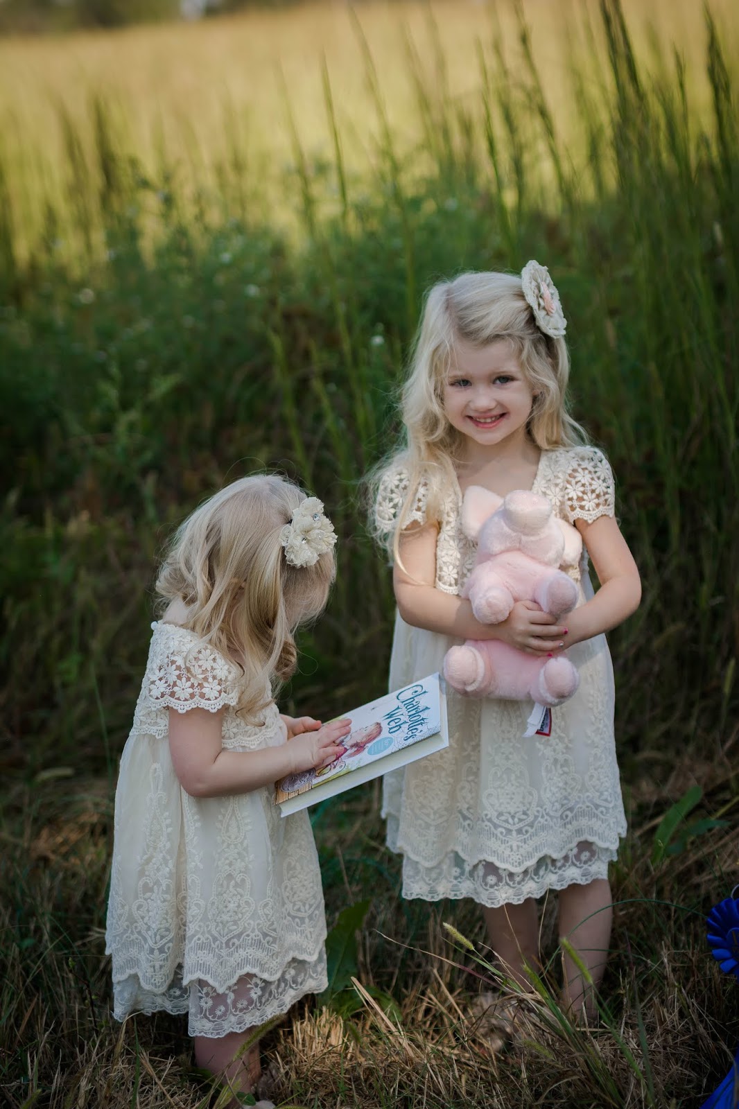 Since Raley was 6 months old, Danielle from Elles Photography has been our one and only photographer. She always does such an amazing job and she takes my crazy ideas and runs with them. Last year Danielle had the great idea to do a Charlotte’s Web inspired photo shoot and asked if I minded if she took some pictures of my girls. (Duh, of course I don’t mind!) She has the best eye for photo spots around town so she took us out to this beautiful field to get these vintage country shots. I’m excited to get to share them today! Take a look!